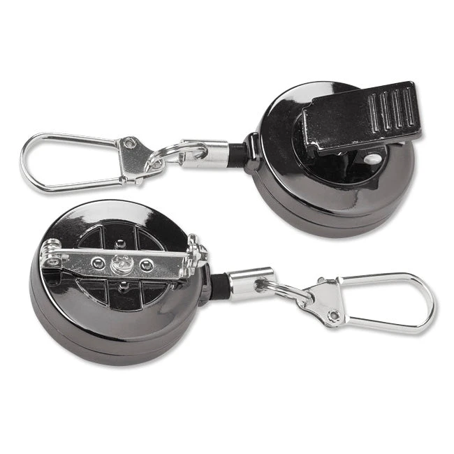 This premium zinger features a black nickel finish and full metal construction, so they can handle all the abuse you can give them. Built with a 22″ wire cord, a rubber bumper, and a locking lobster clasp for making sure your tools don’t end up as shiny objects at the bottom of the stream. Available in both clip-on and pin-on models. Imported.