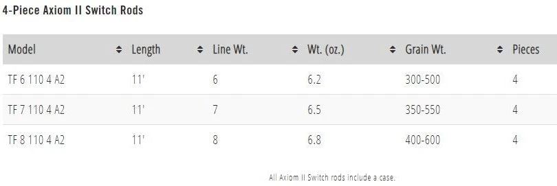 The Axiom II switch family features the same easy loading, close quarters casting attributes, in medium-action and medium stiffness, engineered to fit the angler and the scenario, (not the other way around). The Axiom II switch rod offers the optimization of the benefits of two-handed or spey style casting, but with a shorter lever (to accommodate medium sized water, or tight-quarters fishing out of a boat). Due to the unique double-helix of Kevlar embedded within the blank, anglers can maintain load and easily cast heavy sink tips, long scandi lines and indicators or lead without fear of lost distance and rod performance.