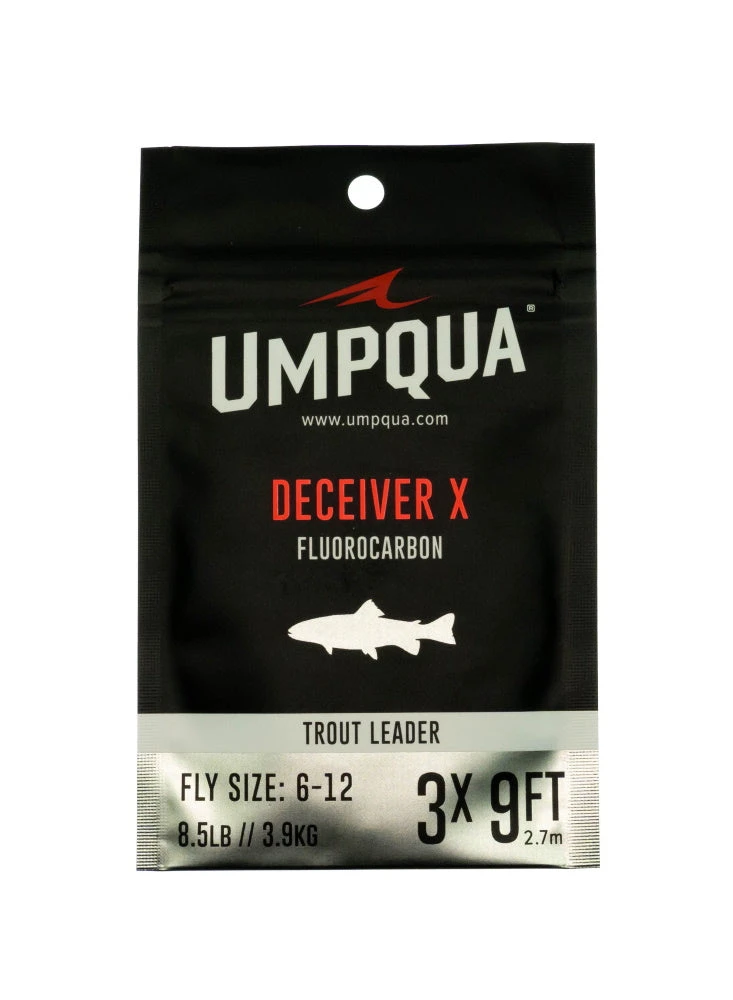 With Best-In-Class knot-strength, abrasion resistance and ultra-low visibility, Deceiver X is the premium standard in fluorocarbon material. Deceiver X pays tribute to the original and first fluorocarbon tippet brought to fly-fishing 20 years ago, Umpqua Deceiver. Now on a 50-yard spool, Deceiver X also offers the best value in premium FC material.